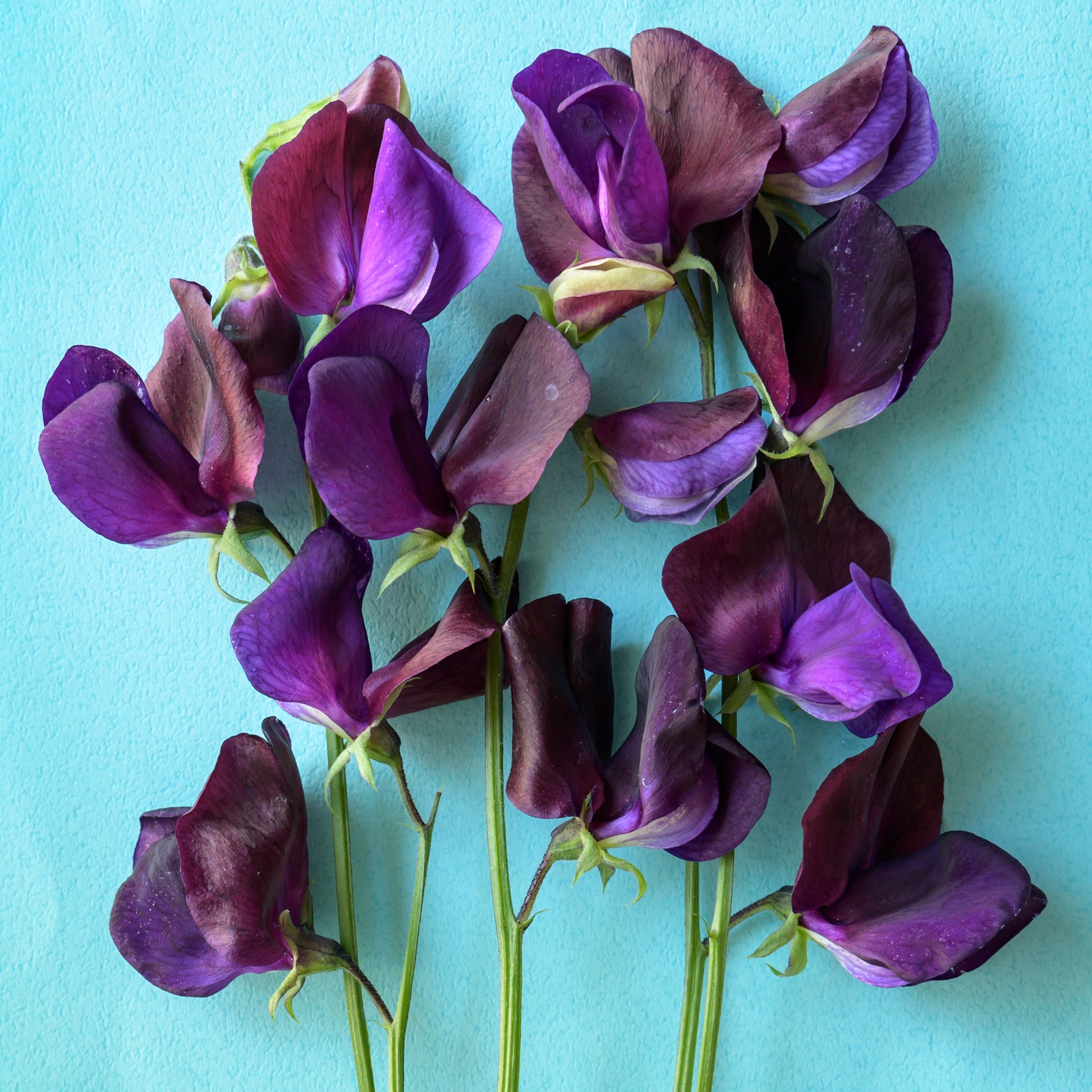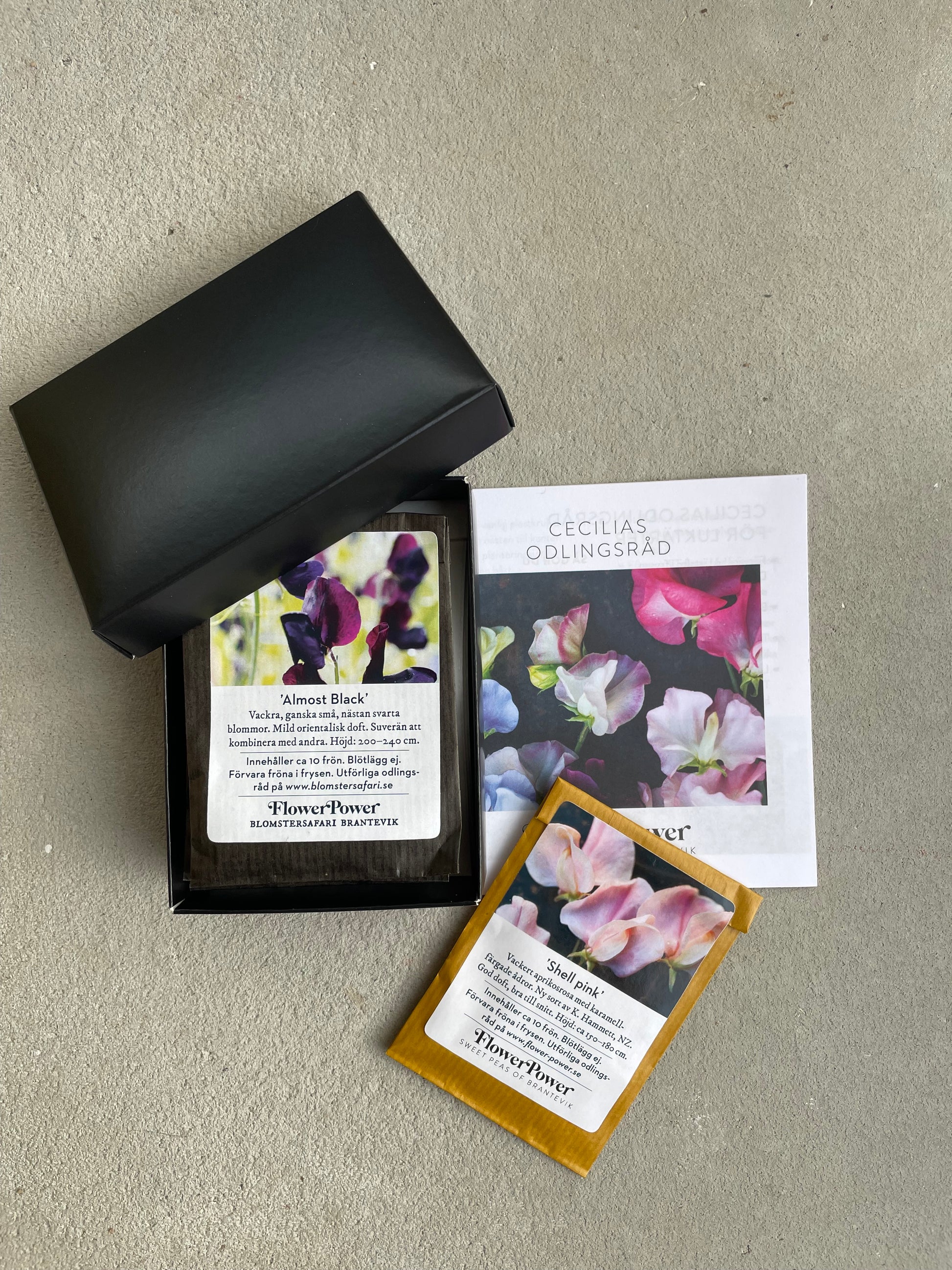 En dramatisk kompott av våra mörkaste sorter. Här med ett litet inslag av pärlemorrosa. Alla sorter utom ’Midnight’ är grandifloror och alltså lite mindre i storleken. Både i blomman och på höjden. Fröerna kommer i en fin presentask, perfekt att ge bort.